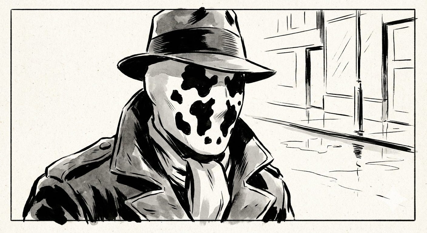 Le nom renvoie au personnage de Walter Kovacs dans la série de bande dessinée Watchmen d’Alan Moore (DC Comics, 1986). Rorschach y est un justicier masqué, solitaire, ultra-conservateur, dont la devise est “jamais de compromis”. Moore avait conçu ce personnage comme une critique — un exemple de ce que donne le fanatisme moral poussé à son terme. Il confiera plus tard avoir été surpris de constater que des lecteurs s’identifiaient sincèrement à lui. L’administrateur du compte est de ceux-là. Sur son blog, il a consacré un article entier à cette identification, présentant Rorschach comme “le sens de l’Intuition, une forme de connaissance supra-rationnelle” face aux élites analytiques. La bio du compte X résume la posture : “Marginal et sans attaches, je me contente d’assister aux derniers soubresauts de ce monde corrompu.”