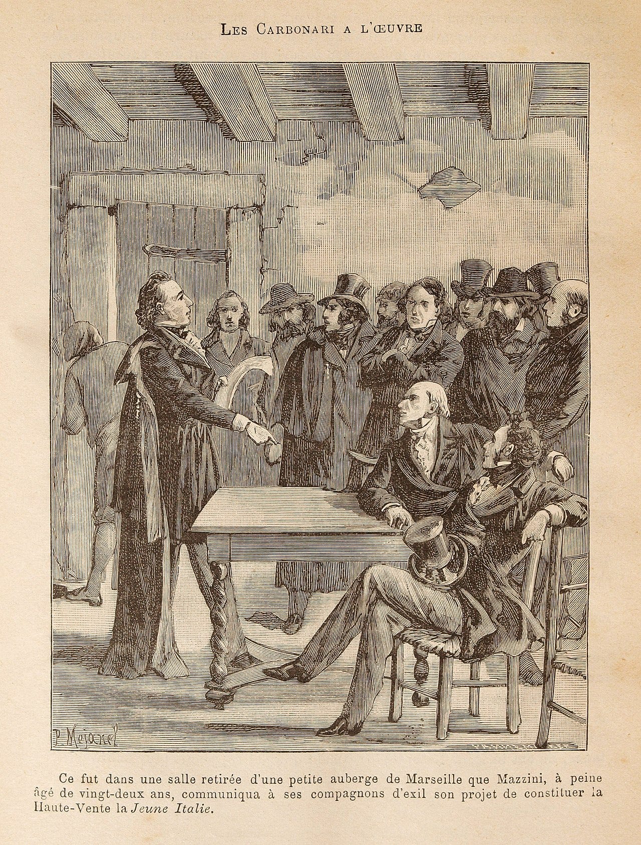 Dans l’Italie du début du XIXe siècle, un réseau de sociétés secrètes à visée politique agite la péninsule : les Carbonari — les « charbonniers » — organisés au sein de ce que l’on appelle la Carboneria. Après 1815, ces groupes deviennent l’un des principaux foyers d’opposition aux régimes imposés par la Restauration, portés par un horizon libéral et patriotique : obtenir des constitutions, une représentation politique, défendre les intérêts italiens face aux puissances étrangères. Leur influence contribue à préparer le terrain du Risorgimento, ce mouvement d’unification de l’Italie, même si les Carbonari ne portent jamais un programme unique — certains aspirent à la république, d’autres à une monarchie constitutionnelle, d’autres encore se contentent de réformes administratives ou de résistance aux tutelles étrangères (Encyclopædia Britannica, « Carbonari »).
