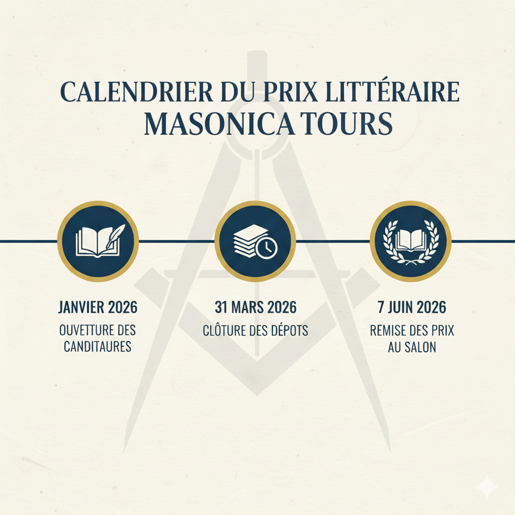 - Remise du Prix. Le 7 juin 2026 à 12h, lors du Salon du Livre maçonnique Masonica Tours.